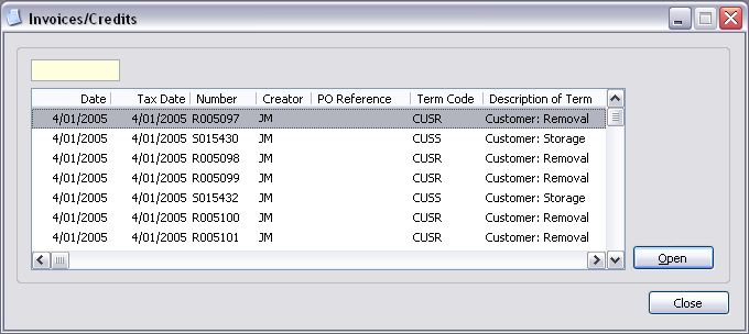 | Open | Open the highlighted invoice/credit (see - Open Invoice). |