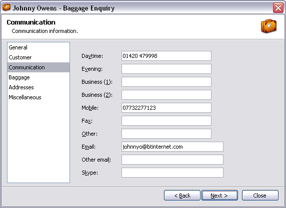 Navigation: Baggage Enquiries > Insert Baggage Enquiry > Insert Baggage Enquiry - Communication |
